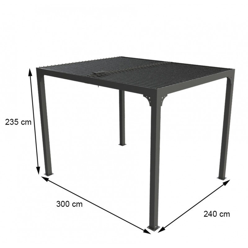 Technical features: - Structure: 1.2 mm thick aluminum, anthracite gray color - Cover: 90 mm thick aluminum panels, 1 mm thick, anthracite gray color, adjustable up to 90° - Supplied with: 4 feet size 10 x 10 cm, thickness 1.2 mm, complete with 16 x 16 cm ground fixing plates, 3 mm thick; 2 side gutters - Delivery packages: n° 4 - Guarantee: 5 years against deformation of the structure (and not on the finish) - External dimensions: 2.40x3.00 m - Front dimensions: 2.40 m - Side dimensions: 3 .00 m - Total area: 7.2 m2 - Height at the ridge: 2.35 m - Passage height: 2.19 m