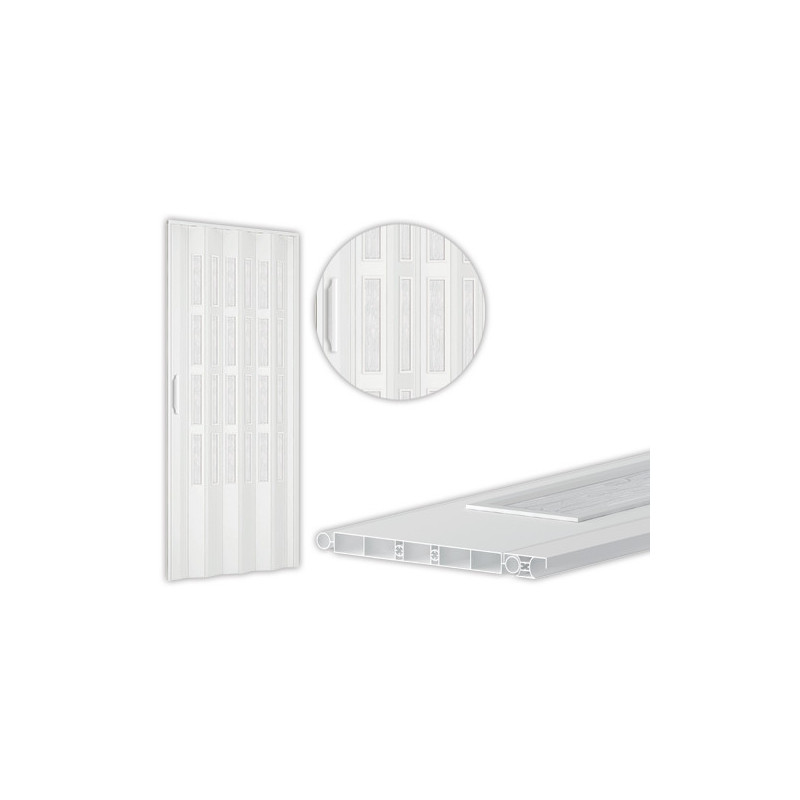 Porta a soffietto in PVC bianco H210 cm con vetro decorativo e chiusura magnetica