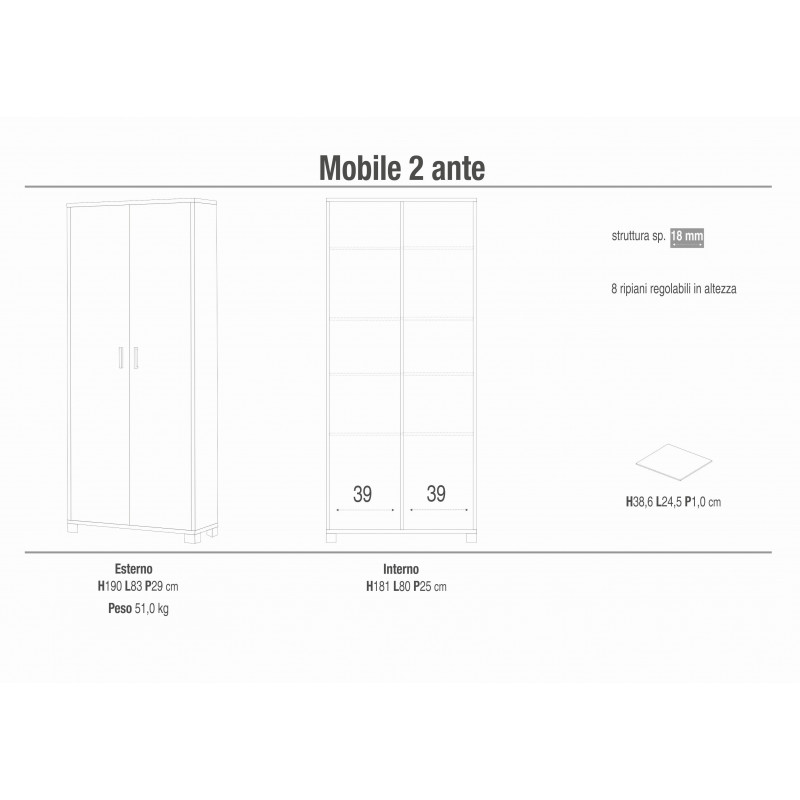 Structure sp. 18mm and doors th. 16mm, sides and top visible, ABS edge without sharp corner Contains 8 adjustable shelves Satin chrome painted handles and feet (in structure finish with Cast Iron or Titanium) Assembled kit cabinet < br /> Structure in Light Elm Color and Front in Flamed White Technical measures: - Height: 190cm - Width: 83cm -...