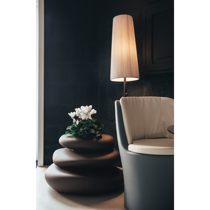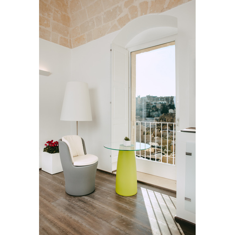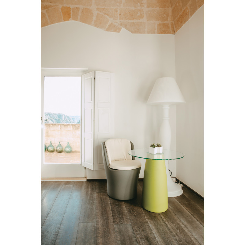 Its sinuous curves and its elegance make the MOON armchair adapt to any type of environment, even the most refined ones. Also suitable for gardens and terraces, its comfortable seat is completed by two finely crafted leather cushions, available in white and grey.