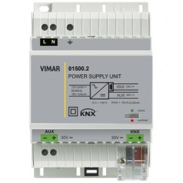 VIMAR 01500.2 Power supply with 30 Vdc Bus output 320 mA 30 Vdc auxiliary output Power supply 120-240 V~ 50/60 Hz With decoupling coil Standard KNX Installation on DIN rail (60715 TH35) Occupies 4 modules of 17.5 mm