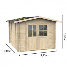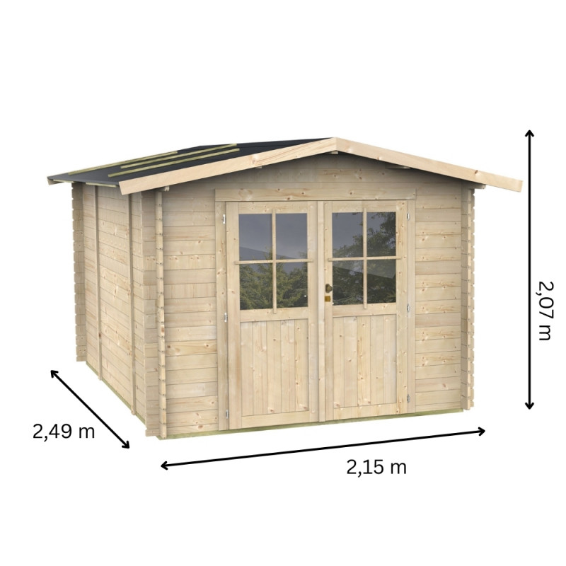Technical dimensions: - Wall thickness 25 mm - External width (A) 215 cm - External depth (B) 249 cm - Internal width (C) 192 cm - Internal depth (D) 226 cm - Internal surface area 4.33 m2 - Minimum height (h1) 183 cm - Maximum height (h2) 207 cm - Eaves length (G) 268 cm - Pitch development (S) 132 cm - Roof area 7.08 m2