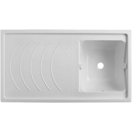 Furniture in white W100 water-repellent melamine, thickness 18 mm Doors with square corners Chrome handles Bath in acid-resistant plastic resin Washing board in polypropylene Self-cleaning siphon complete with drain and overflow 15 mm height adjustable feet Drillable tank for tap installation Siphon discharge 35-45 cm from the ground