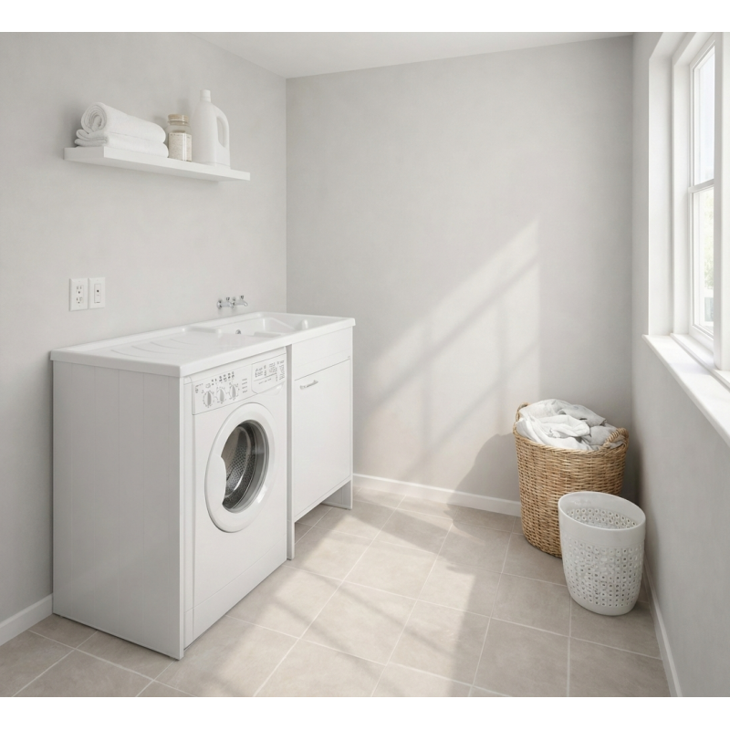 Washing machine cabinet in W100 white waterproof melamine, thickness 18 mm Doors with square corners Satin handles and feet Drillable plastic resin tank for tap installation Washing board in polypropylene Self-cleaning siphon complete with drain and overflow 15 mm height adjustable feet Siphon discharge 35-45 cm from the ground
