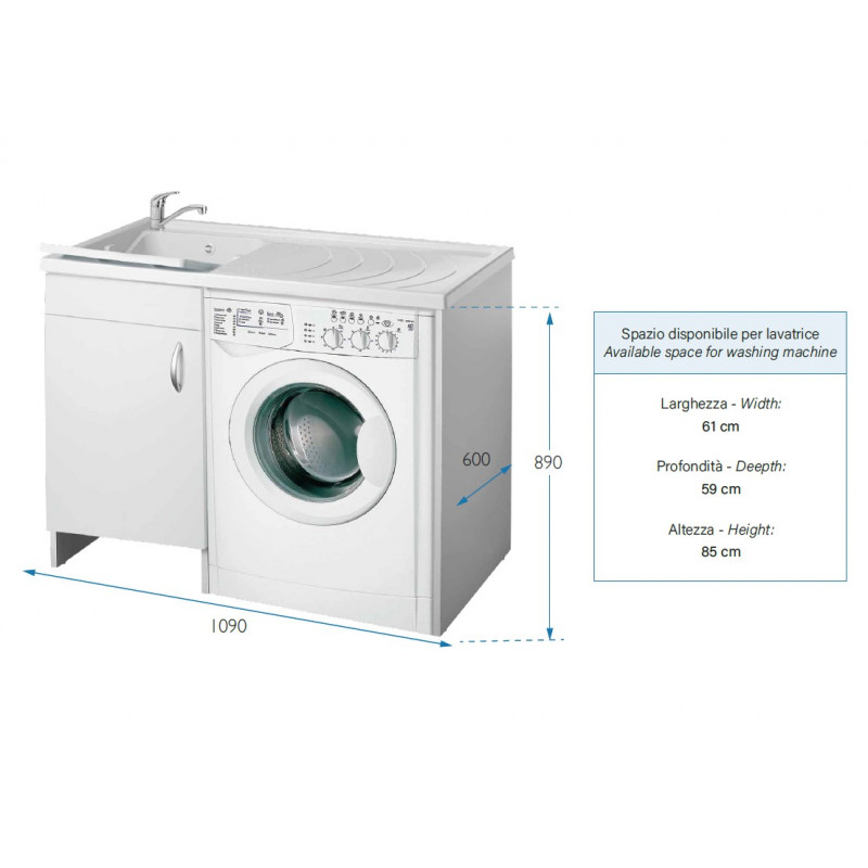 Washing machine cabinet in W100 white waterproof melamine, thickness 18 mm Doors with square corners Satin handles and feet Drillable plastic resin tank for tap installation Washing board in polypropylene Self-cleaning siphon complete with drain and overflow 15 mm height adjustable feet Siphon discharge 35-45 cm from the ground