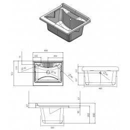 Furniture in white W100 water-repellent melamine, thickness 18 mm Doors with square corners Chrome handles Bath in acid-resistant plastic resin Washing board in polypropylene Self-cleaning siphon complete with drain and overflow 15 mm height adjustable feet Drillable tank for tap installation Siphon discharge 35-45 cm from the ground