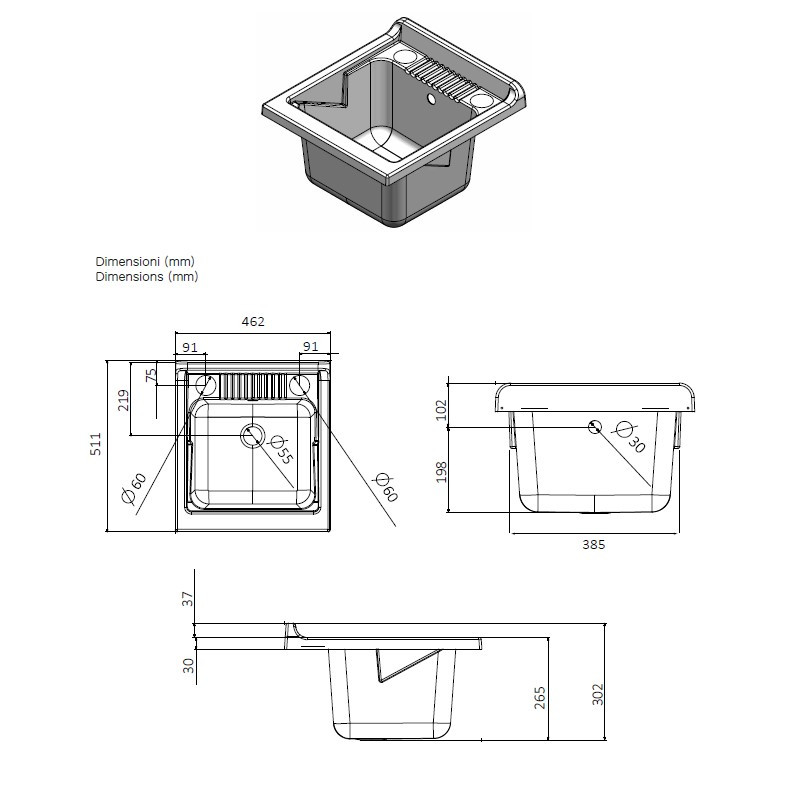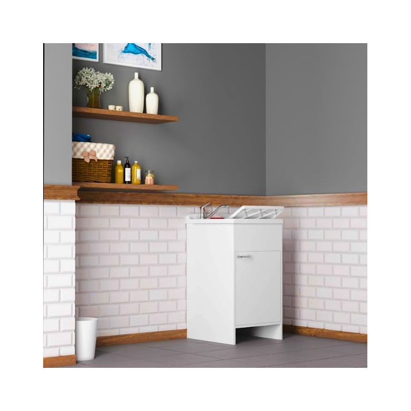 Furniture in white W100 water-repellent melamine, thickness 18 mm Doors with square corners Chrome handles Bath in acid-resistant plastic resin Washing board in polypropylene Self-cleaning siphon complete with drain and overflow 15 mm height adjustable feet Drillable tank for tap installation Siphon discharge 35-45 cm from the ground