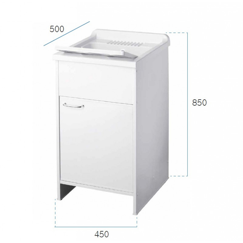 Washing machine cabinet in W100 white waterproof melamine, thickness 18 mm Doors with square corners Satin handles and feet Drillable plastic resin tank for tap installation Washing board in polypropylene Self-cleaning siphon complete with drain and overflow 15 mm height adjustable feet Siphon discharge 35-45 cm from the ground