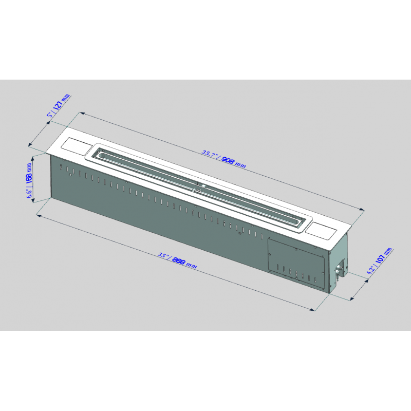External dimensions: Width 88.5cm Depth 13.5cm Height 56cm Weight 18.1 kg Technical data: Power: 900/1800 W AC- 220-240/50hz Absorption in flame function (no heating): 30 watts Temperature: 18°-30° Daily and weekly programming Adjustable electronic timer from 1 ha 8 h 5 flame and brazier intensity adjustments 3D Wood Effect + Crystal Stone CURVED...