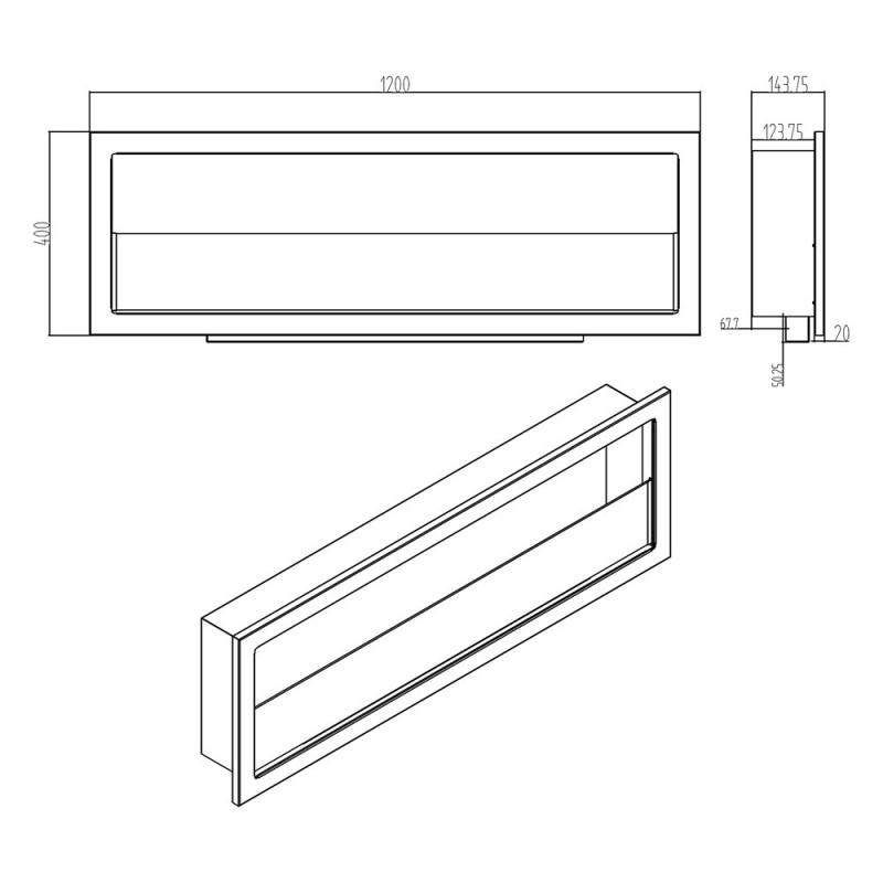 External dimensions: Width 122cm Depth 9.5cm Height 56cm Weight 19.8 kg Technical data: Power: 900/1800 W AC- 220-240/50hz Absorption in flame function (no heating): 30 watts Temperature: 18°-30° Daily and weekly programming Adjustable electronic timer from 1 to 8 h Digital thermostat 5 settings for flame and brazier intensity 9 modifiable flame colors 3D...