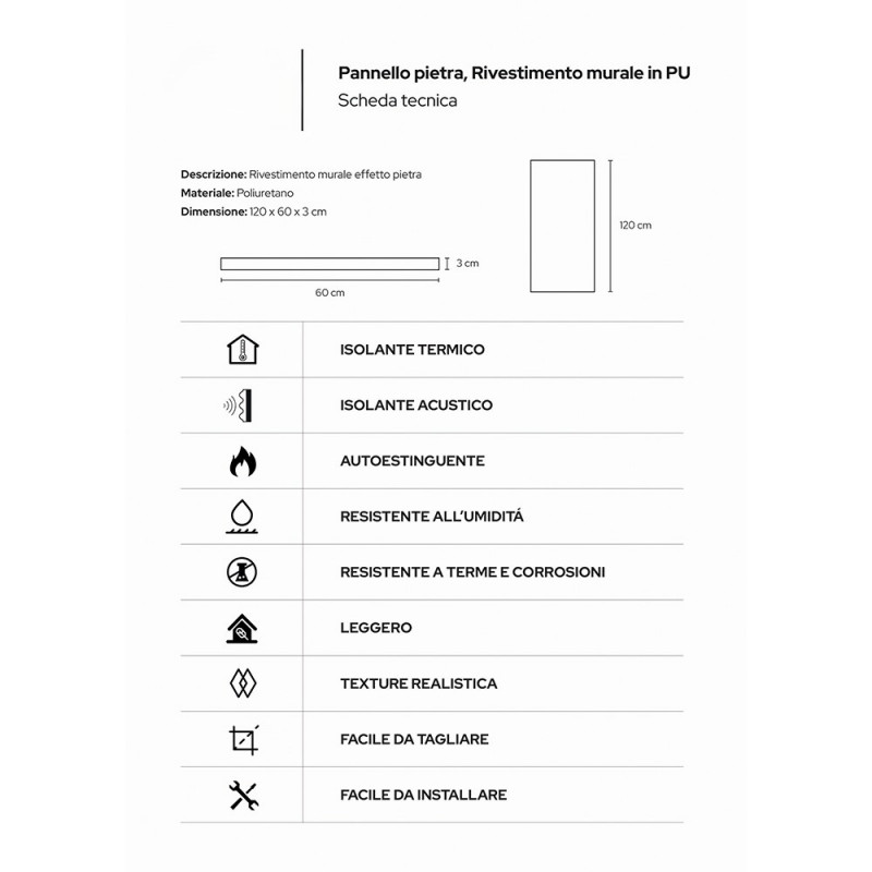 Pannello decorativo effetto roccia pietra 3D set 10 pz 7,2 mt2 rivestimento murale in PU 120 x 60 x 3 Grigio Vulcano