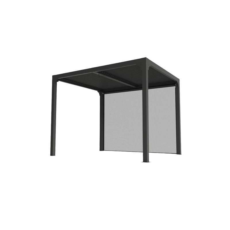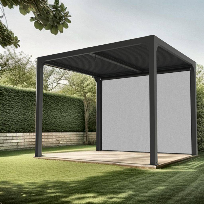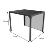 Caractéristiques techniques : - Structure : aluminium épaisseur 1,2 mm, coloris gris anthracite - Habillage : panneaux aluminium épaisseur 90 mm, épaisseur 1 mm, coloris gris anthracite, orientables jusqu'à 90° - Livré avec : 4 pieds dimension 10 x 10 cm, épaisseur 1,2 mm, complet avec plaques de fixation au sol de 16 x 16 cm, épaisseur 3 mm ; 2...