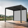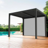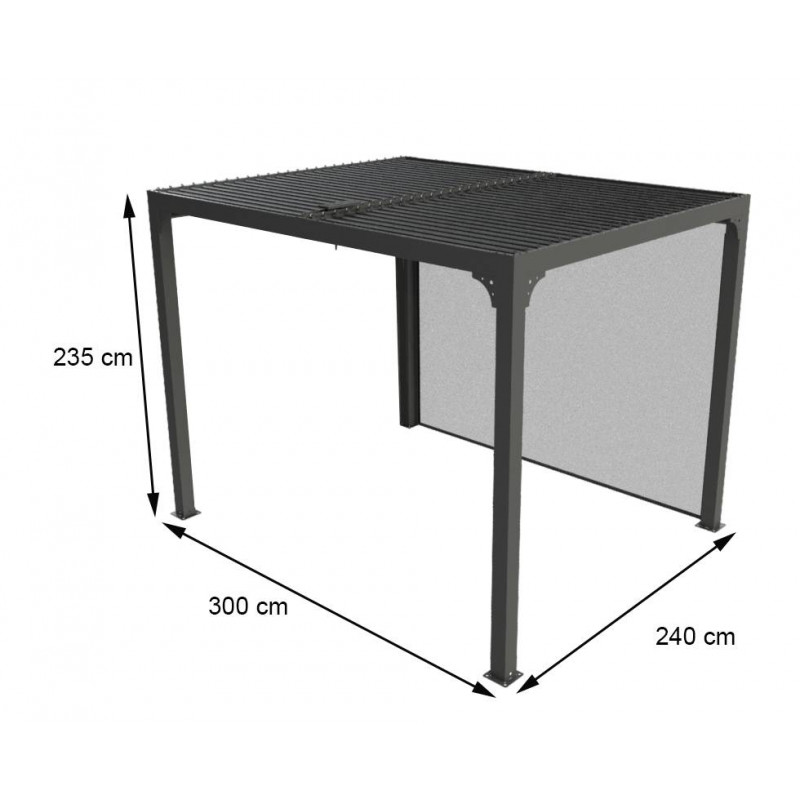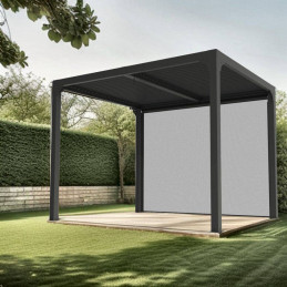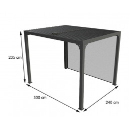 Caractéristiques techniques : - Structure : aluminium épaisseur 1,2 mm - Couleur : gris anthracite - Capot : panneaux aluminium épaisseur 90 mm, épaisseur 1 mm, coloris gris anthracite, orientables jusqu'à 90° - Livré avec : 4 mâts dim. 10 x 10 cm , 1,2 mm d'épaisseur, complet avec plaques de fixation au sol de 16 x 16 cm, 3 mm d'épaisseur ; 2 gouttières...