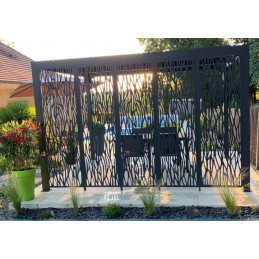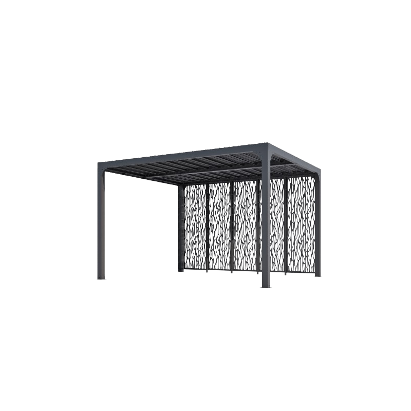Caractéristiques techniques : - Structure : aluminium épaisseur 1,2 mm, coloris gris anthracite - Habillage : panneaux aluminium épaisseur 90 mm, épaisseur 1 mm, coloris gris anthracite, orientables jusqu'à 90° - Livré avec : 4 pieds dimension 10 x 10 cm, épaisseur 1,2 mm, complet avec plaques de fixation au sol de 16 x 16 cm, épaisseur 3 mm ; 2...