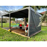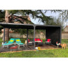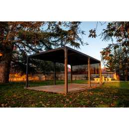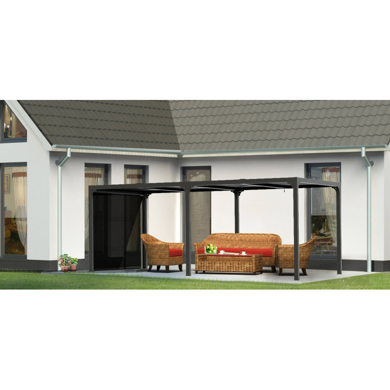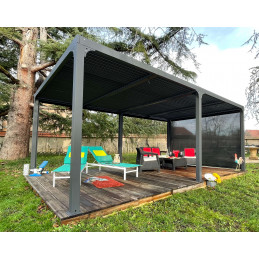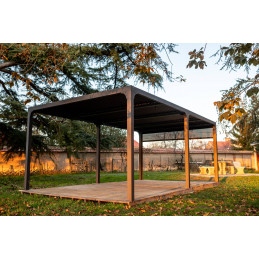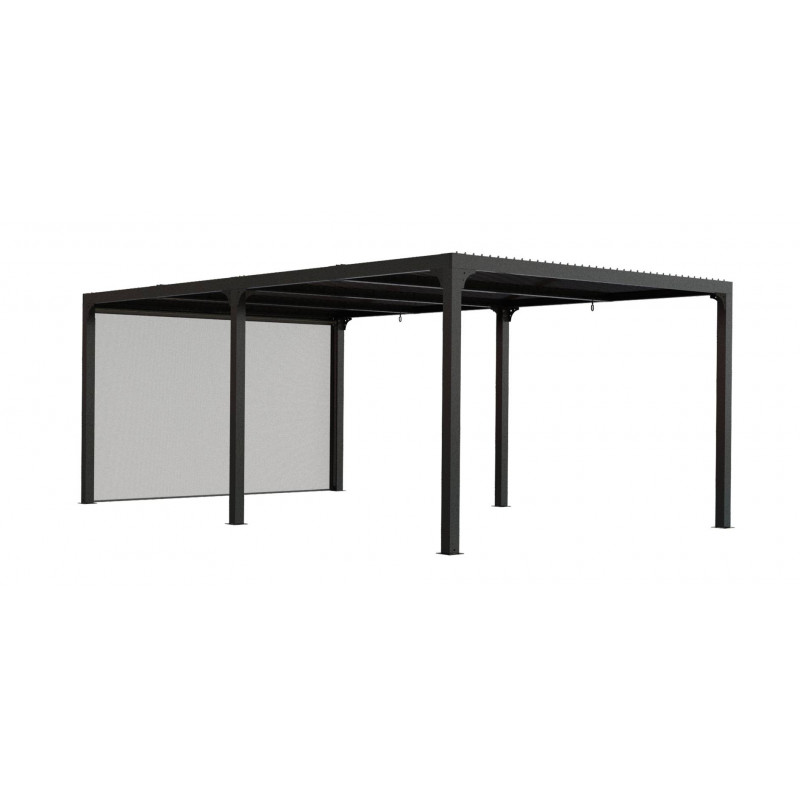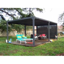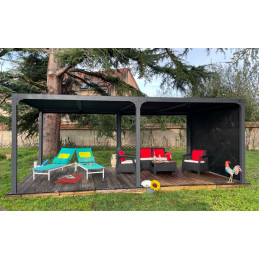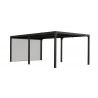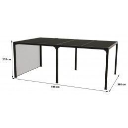 Caractéristiques techniques : - Structure : aluminium épaisseur 1,2 mm - Couleur : gris anthracite - Capot : panneaux aluminium épaisseur 90 mm, épaisseur 1 mm, coloris gris anthracite, orientables jusqu'à 90° - Livré avec : 4 mâts dim. 10 x 10 cm , 1,2 mm d'épaisseur, complet avec plaques de fixation au sol de 16 x 16 cm, 3 mm d'épaisseur ; 2 gouttières...