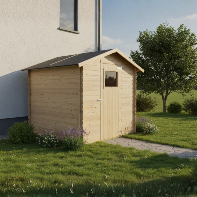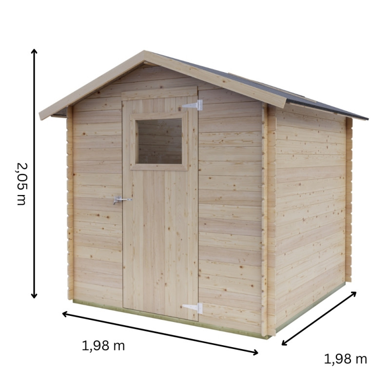 Dimensions techniques : -Epaisseur mur 19 mm -Largeur externe (A) 198 cm -Profondeur externe (B) 198 cm -Largeur interne (C) 176 cm -Profondeur interne (D) 176 cm -Surface interne 3,10 m2 -Hauteur minimum ( h1) 183 cm - Hauteur maximale (h2) 215 cm - Longueur avant-toit (G) 208 cm - Développement en pente (S) 123 cm - Surface de toiture 5,12 m2