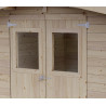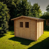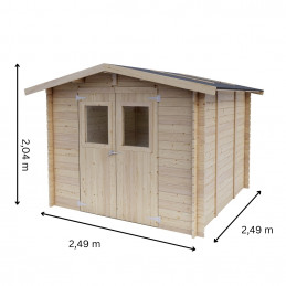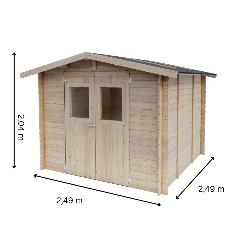 Dimensions techniques : -Epaisseur mur 19 mm -Largeur externe (A) 198 cm -Profondeur externe (B) 198 cm -Largeur interne (C) 176 cm -Profondeur interne (D) 176 cm -Surface interne 3,10 m2 -Hauteur minimum ( h1) 183 cm - Hauteur maximale (h2) 215 cm - Longueur avant-toit (G) 208 cm - Développement en pente (S) 123 cm - Surface de toiture 5,12 m2