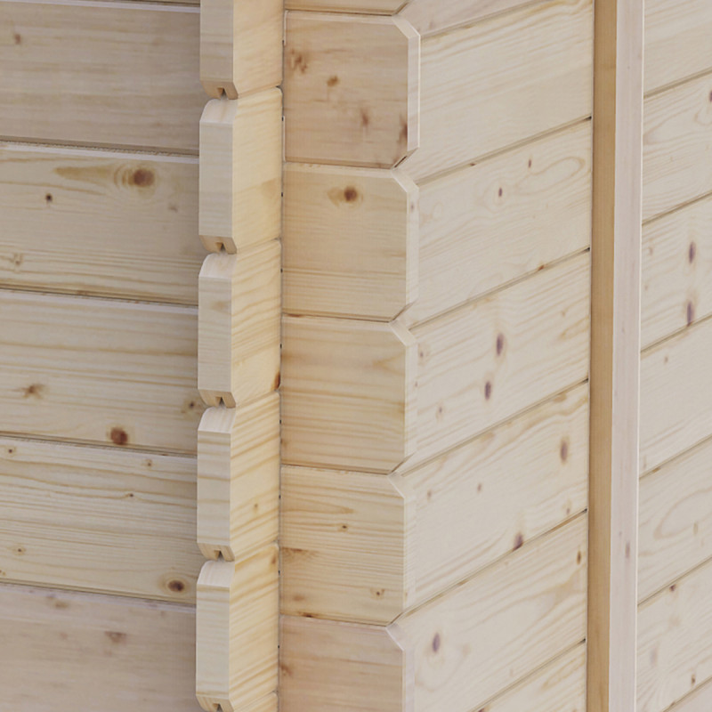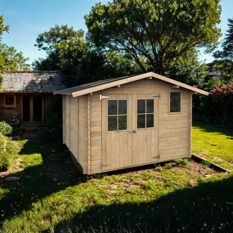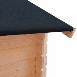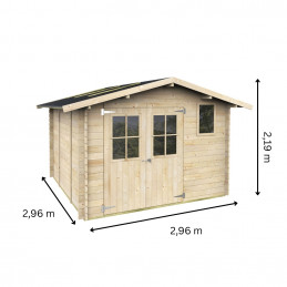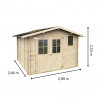 Dimensions techniques : -Epaisseur mur 19 mm -Largeur externe (A) 198 cm -Profondeur externe (B) 198 cm -Largeur interne (C) 176 cm -Profondeur interne (D) 176 cm -Surface interne 3,10 m2 -Hauteur minimum ( h1) 183 cm - Hauteur maximale (h2) 215 cm - Longueur avant-toit (G) 208 cm - Développement en pente (S) 123 cm - Surface de toiture 5,12 m2