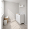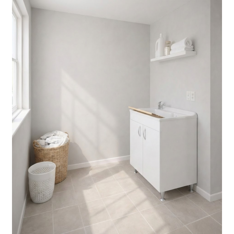 Meuble lave-linge en mélaminé hydrofuge blanc W100, épaisseur 18 mm Portes à coins carrés Poignées et pieds satinés Réservoir de résine plastique perçable pour l'installation du robinet Planche à laver en polypropylène Siphon autonettoyant complet avec vidange et trop-plein Pieds réglables en hauteur de 15 mm Évacuation du siphon à 35-45 cm du sol