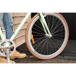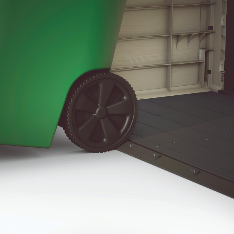 Il pavimento incluso con rampa integrata protegge da umidità e sporco e facilita l’ingresso di bidoni e biciclette.