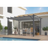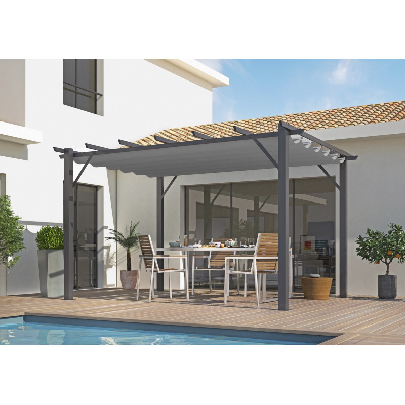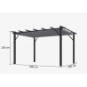 Materiale struttura: alluminio verniciato a polvereColore struttura: grigio antraciteMateriale lamelle: alluminioSpessore montanti: 1,2 mmSpessore lamelle: 1 mmNumero lamelle: 52Orientamento lamelle: manuale con manovella, fino a 90°Piedi: 4 pali da 100x100 mmDimensioni: 240 x 300 x 235 cmSuperficie coperta: 7,2 m²Altezza passaggio: 2,19 mGrondaie:...