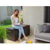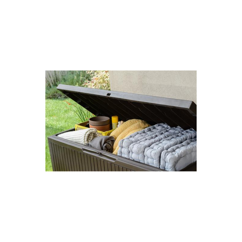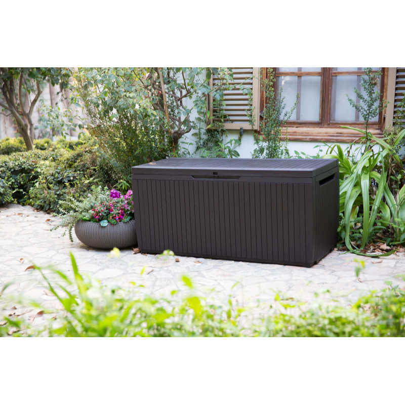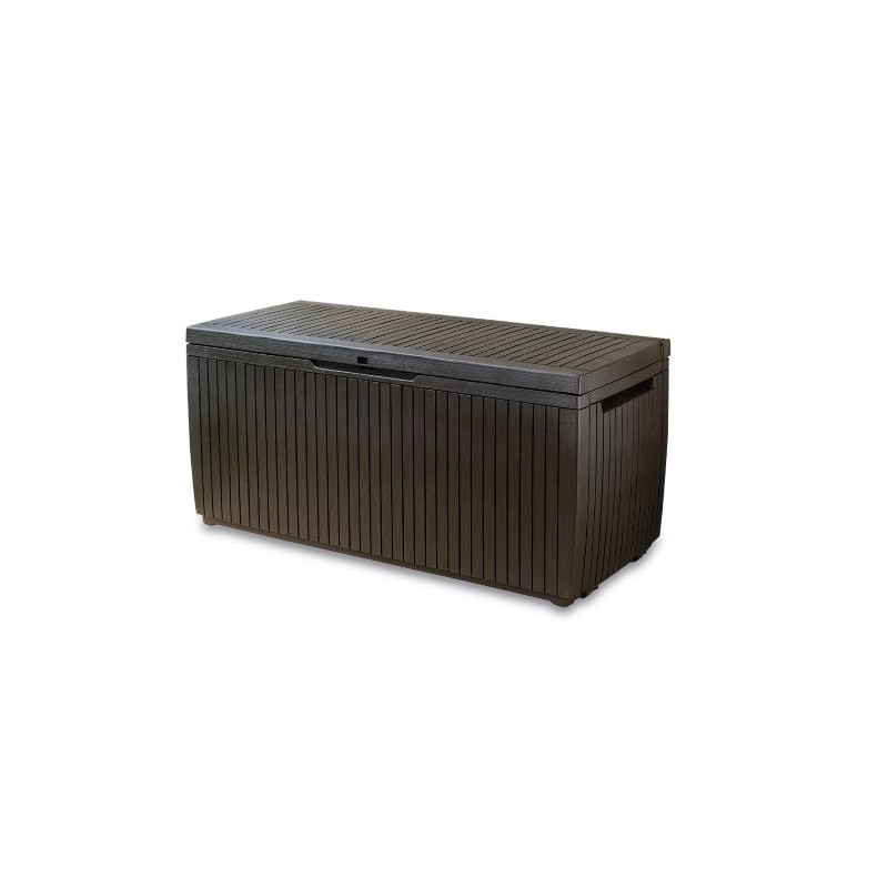 Marca: KeterCapacità: 454 LColore: MarroneFinitura: Effetto legnoStruttura interna: MetalloLarghezza prodotto: 145 cmProfondità prodotto: 69,7 cmAltezza prodotto: 60,3 cmLarghezza imballo: 151,6 cmProfondità imballo: 75,5 cmAltezza imballo: 15,4 cmPeso imballo: 21 kgPortata seduta: 300 kgSeduta: 2 adultiApertura: Pistoni integratiChiusura: Sistema...