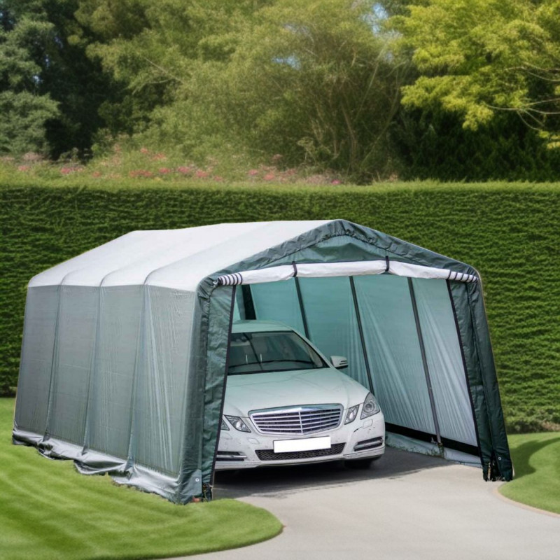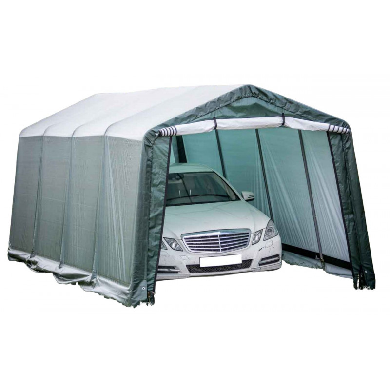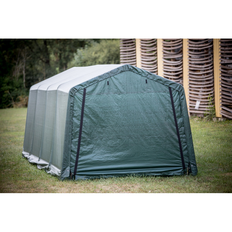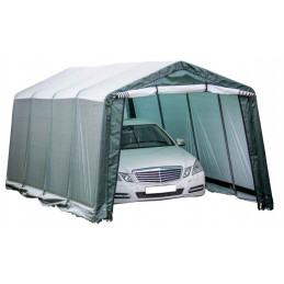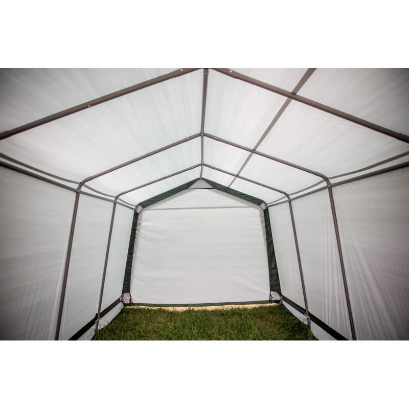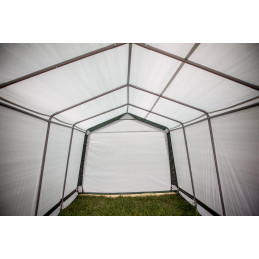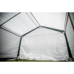 Materiale telo: polietilene rinforzato 195 g/m²Struttura: acciaio verniciato Ø 34 mm, spessore 0,7 mmColore telo: esterno verde scuro, interno biancoDimensioni esterne: L 305 x P 305 x H 244 cmSuperficie utile: 9,30 m²Volume utile: 22,70 m³Altezza pareti: 1,93 mAltezza colmo: 2,44 mPorta: con zip, L 2,30 x H 1,90 mMontaggio: a clips con tenditori a...