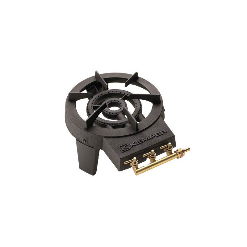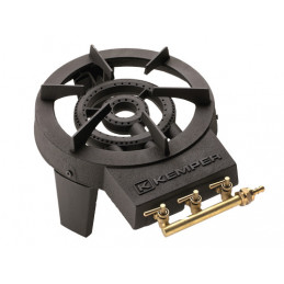 Fornellone a gas Kemper con diametro di 28,5 cm, dotato di doppio bruciatore concentrici. Struttura in ghisa resistente, ideale per bombole butano/propano. Potenza termica di 8,6 kW, tre rubinetti indipendenti per una regolazione precisa della fiamma. Adatto per uso esterno, campeggio e cucine professionali.