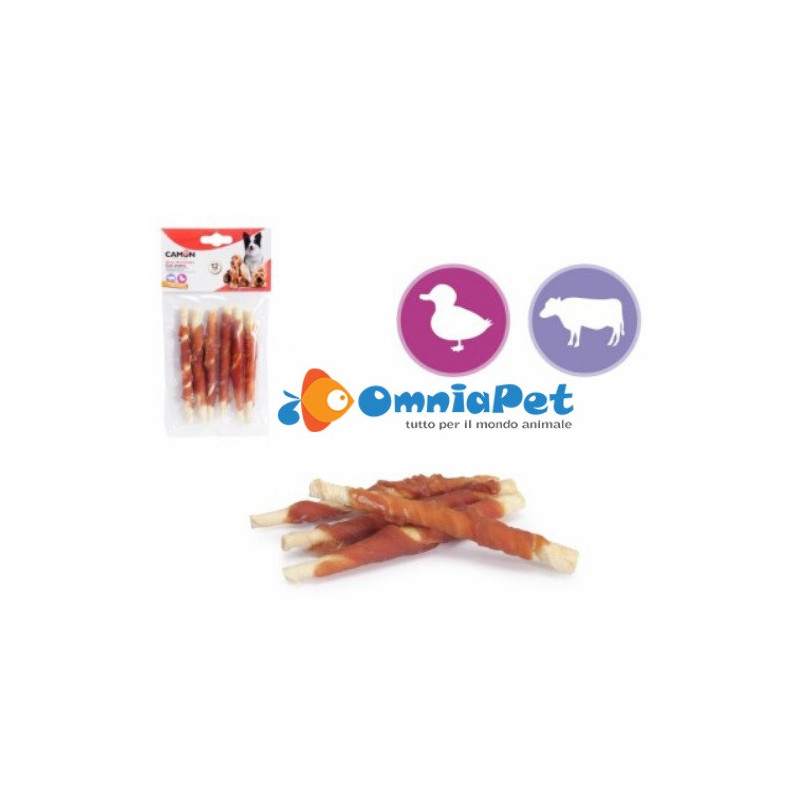 Gli Snack Camon Rolls all’anatra sono ossi arrotolati di pelle bovina con anatra, senza additivi.