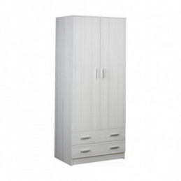 Tipologia: armadio 2 ante 2 cassetti in kit Colore: bianco liscio Dimensioni: 77×52×182 cm Materiale: pannello truciolare nobilitato Spessore: 16 mm ante Interno: barra portabiti, 1 ripiano regolabile Guide: cassetto in plastica Maniglie: cromo satinato Montaggio: da assemblare