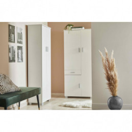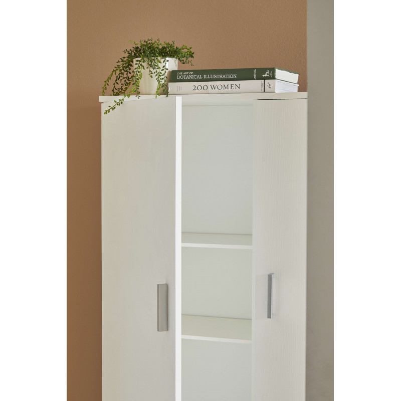 Tipologia: armadio 2 ante in kit Colore: bianco fiammato Dimensioni: 62×34×178 cm Materiale: pannello truciolare nobilitato Spessore: 16 mm ante Interno: 3 ripiani regolabili, 1 fisso Maniglie e Piedini: cromo satinato Montaggio: da assemblare
