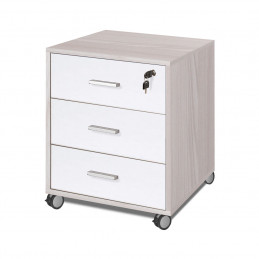Cassettiera da ufficio già montata, struttura in olmo chiaro e Frontali in bianco fiammato. Dotata di 3 cassetti con guide a rullo, uno con serratura, ruote piroettanti con fermo e Maniglie cromo satinato. Robusta e funzionale.