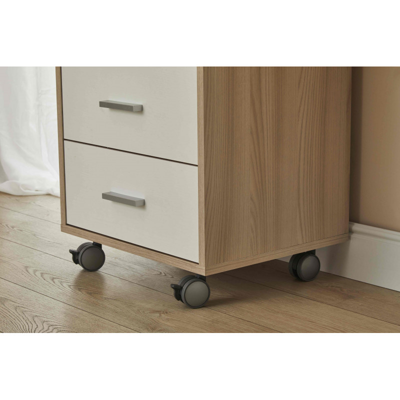 Cassettiera su ruote con struttura e cassetti in finitura olmo chiaro. Include tre cassetti con guide a rullo, di cui uno dotato di serratura, e ruote piroettanti con freno per una facile mobilità. Le Maniglie in finitura cromo satinato aggiungono un tocco moderno. Articolo fornito già montato, ideale per ufficio o zona studio.