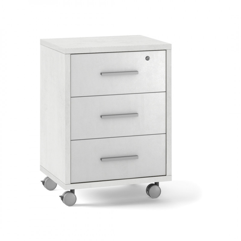 Mobile contenitore su ruote con tre cassetti (uno chiuso a chiave). Struttura e Frontali in bianco opaco. Mobile già montato dotato di ruote con fermo. Design moderno e compatto.