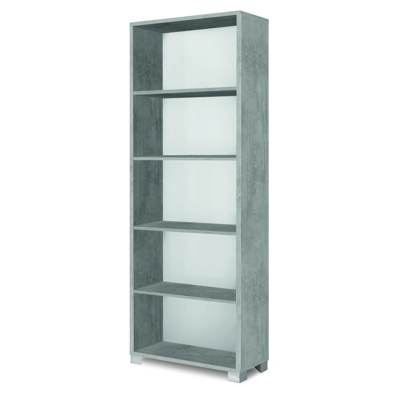 Libreria a giorno alta con struttura e ripiani in colore cemento, schienale bianco e piedini grigio satinato. Include 2 ripiani regolabili, 2 fissi e 4 piedini. Mobile in kit da montare.