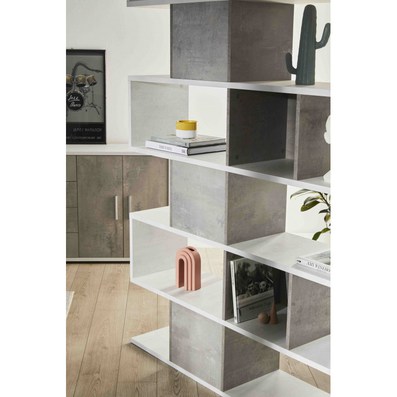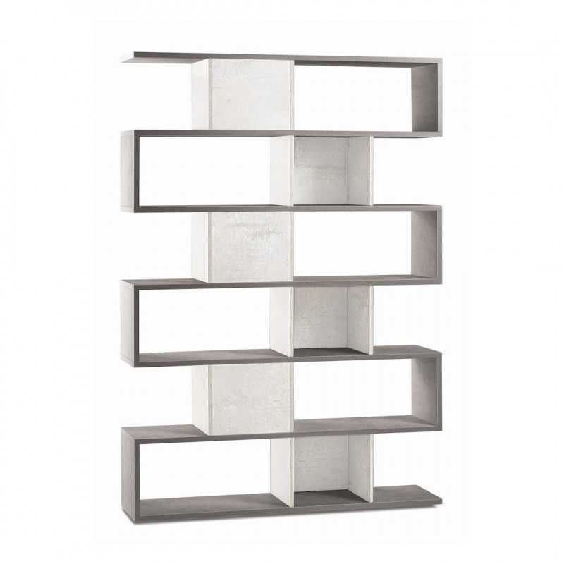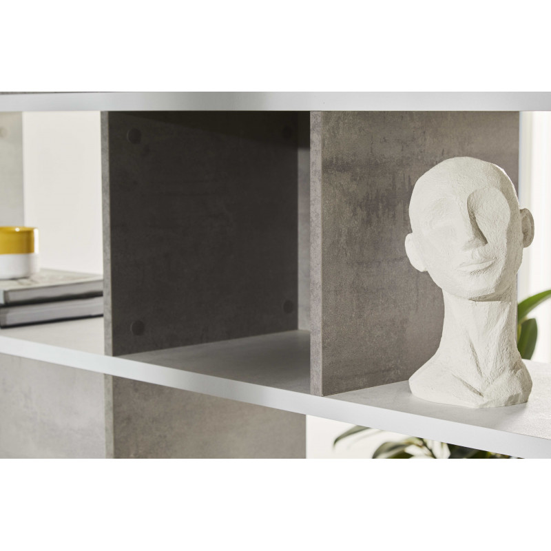 Libreria modulare di grande altezza, adatta per uffici o ambienti residenziali moderni. Struttura in colore cemento, e Frontali in bianco opaco. Costruita con pannelli spessi, con bordi in ABS. In kit da montare, facile da combinare con altri moduli.