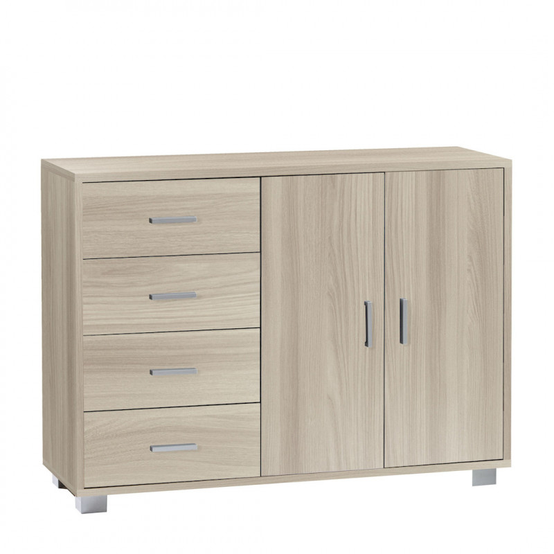 Mobile in kit con Struttura e Frontali in olmo chiaro. Dotato di 2 ante e 4 cassetti con guide a rullo, contiene 1 ripiano regolabile. Maniglie e piedini verniciati cromo satinato. Adatto per soggiorno, studio o camera.