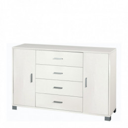 Mobile robusto, struttura e ante in bianco fiammato. Due ante + quattro cassetti su guide a rullo. Include due ripiani regolabili, Maniglie e piedini cromati satinati.