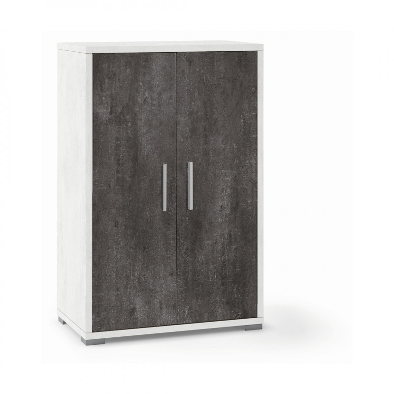 Mobile multiuso da appoggio in kit per montaggio fai–da–te. Struttura in colore bianco opaco, ante in nero opaco. Realizzato con pannelli spessi 25 mm per la struttura e 16 mm per le ante, con bordi in ABS. Interno con 2 ripiani regolabili. Piedini e Maniglie in finitura cromo satinato.