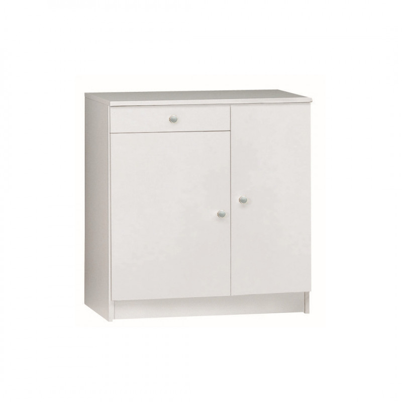 Mobile 2 ante 1 cassetto in kit con Struttura e Frontali in bianco liscio, spessore 16mm. Interno con 2 ripiani regolabili. Guide cassetto in plastica. Pomoli in cromo satinato. Perfetto per bagno, ufficio o cameretta. Bordi ABS. Da montare.