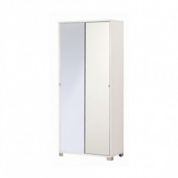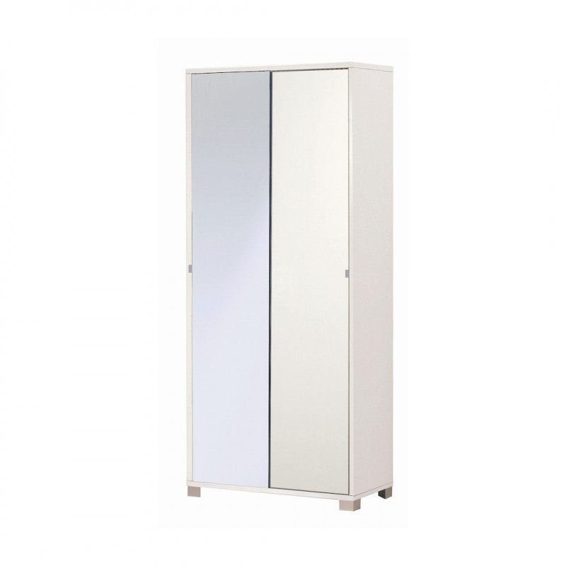 Mobile in kit con struttura bianco fiammato e ante scorrevoli di cui una con specchio. Contiene 8 ripiani regolabili, Maniglie in metallo e piedini cromati satinato. Perfetto per ambienti moderni e luminosi.