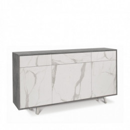 Mobile con tre ante e tre cassetti, struttura in colore cemento e Frontali in marmo Calacatta. Dotato di guide a rullo e apertura push-pull. Contiene tre ripiani regolabili e piedini cromati satinato. Montaggio in kit.