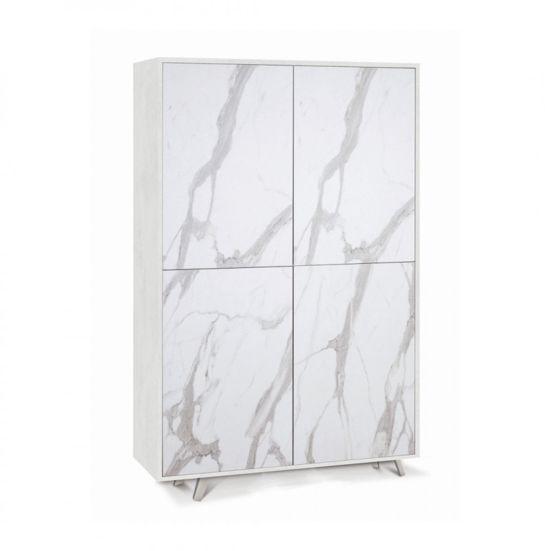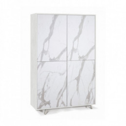 Mobile di grande eleganza con struttura bianco opaco e ante colore marmo calacatta. Dotato di 4 ripiani regolabili, apertura push-pull e piedini cromati satinato. Mobile in kit facile da montare.