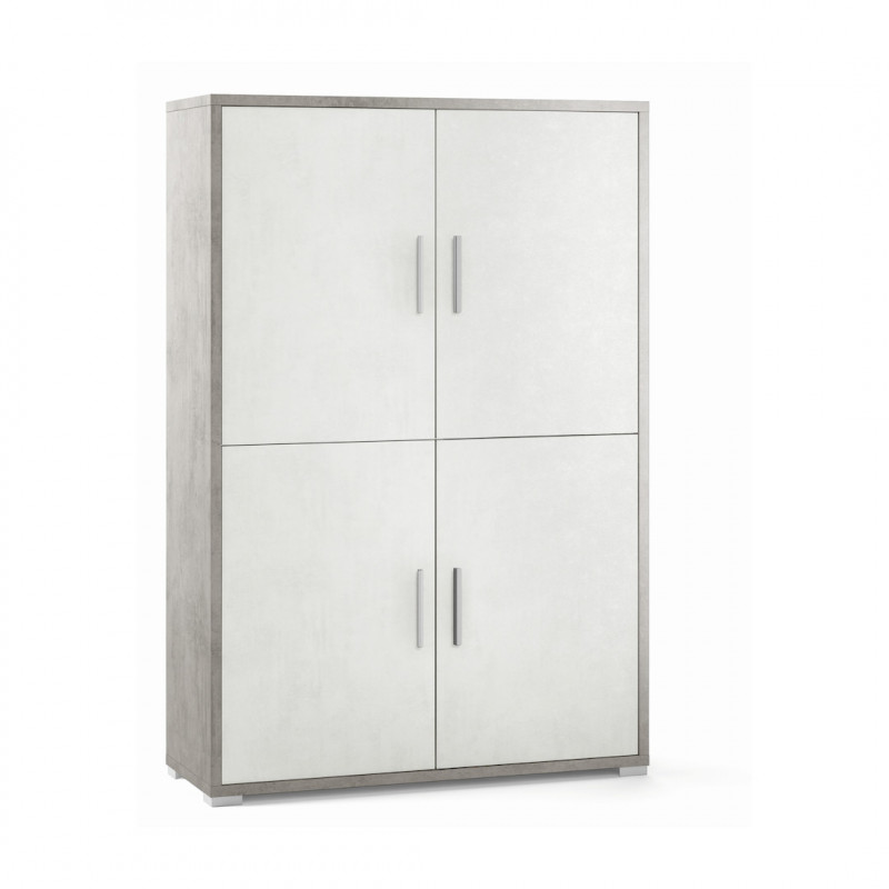 Mobile alto e capiente con quattro ante, perfetto per ambienti come ufficio o zona giorno. Struttura in colore cemento con e Frontali in bianco opaco. Contiene quattro ripiani regolabili. Mobile in kit.