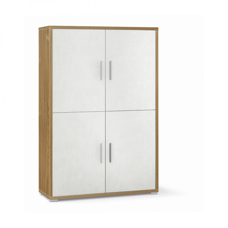Mobile a quattro ante elegante e funzionale, con struttura in colore legno noce e Frontali in bianco opaco. Ideale per ambienti come ufficio, camera o zona giorno. Include quattro ripiani regolabili. Mobile in kit.