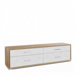 Mobile basso con quattro cassetti, struttura in colore legno noce e Frontali in bianco opaco. Finiture in cromo satinato. Facile da montare grazie al kit incluso.