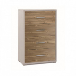 Mobile a quattro cassetti con struttura in bianco opaco e Frontali in colore legno noce. Design raffinato e funzionale. Dotato di guide a rullo e finiture cromate satinato. Richiede montaggio da kit.