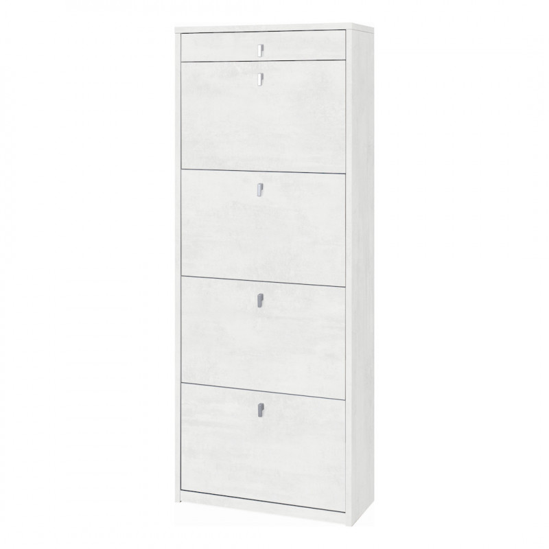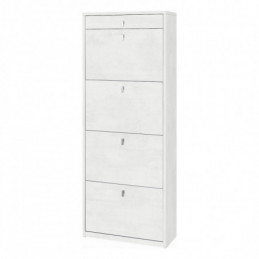 Scarpiera in kit con struttura, ante e cassetto in bianco opaco. Dotata di 4 ante a ribalta doppia profondità e 1 cassetto con guide a sfera. Capacità fino a 20 paia di scarpe. Pomoli verniciati cromo platinato, bordi ABS senza angolo vivo. Soluzione elegante per ingressi e camere da letto moderne.