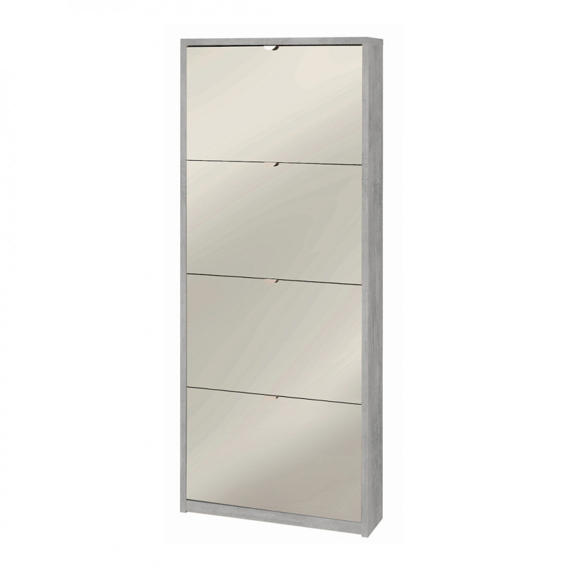 Scarpiera in kit con struttura colore cemento e ante con specchio. Dotata di 4 ante a ribalta singola con profondità ridotta, capacità fino a 10 paia di scarpe. Maniglie in alluminio satinato. Design contemporaneo e funzionale.