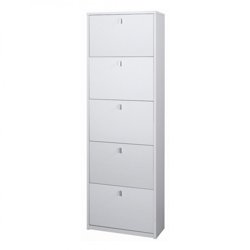 Scarpiera in kit con struttura e ante in bianco fiammato, dotata di 5 ante a ribalta doppia profondità per una capacità di 25 paia di scarpe. Pomoli verniciati cromo platinato. Fianchi e top a vista. Perfetta per ingressi spaziosi e moderni.